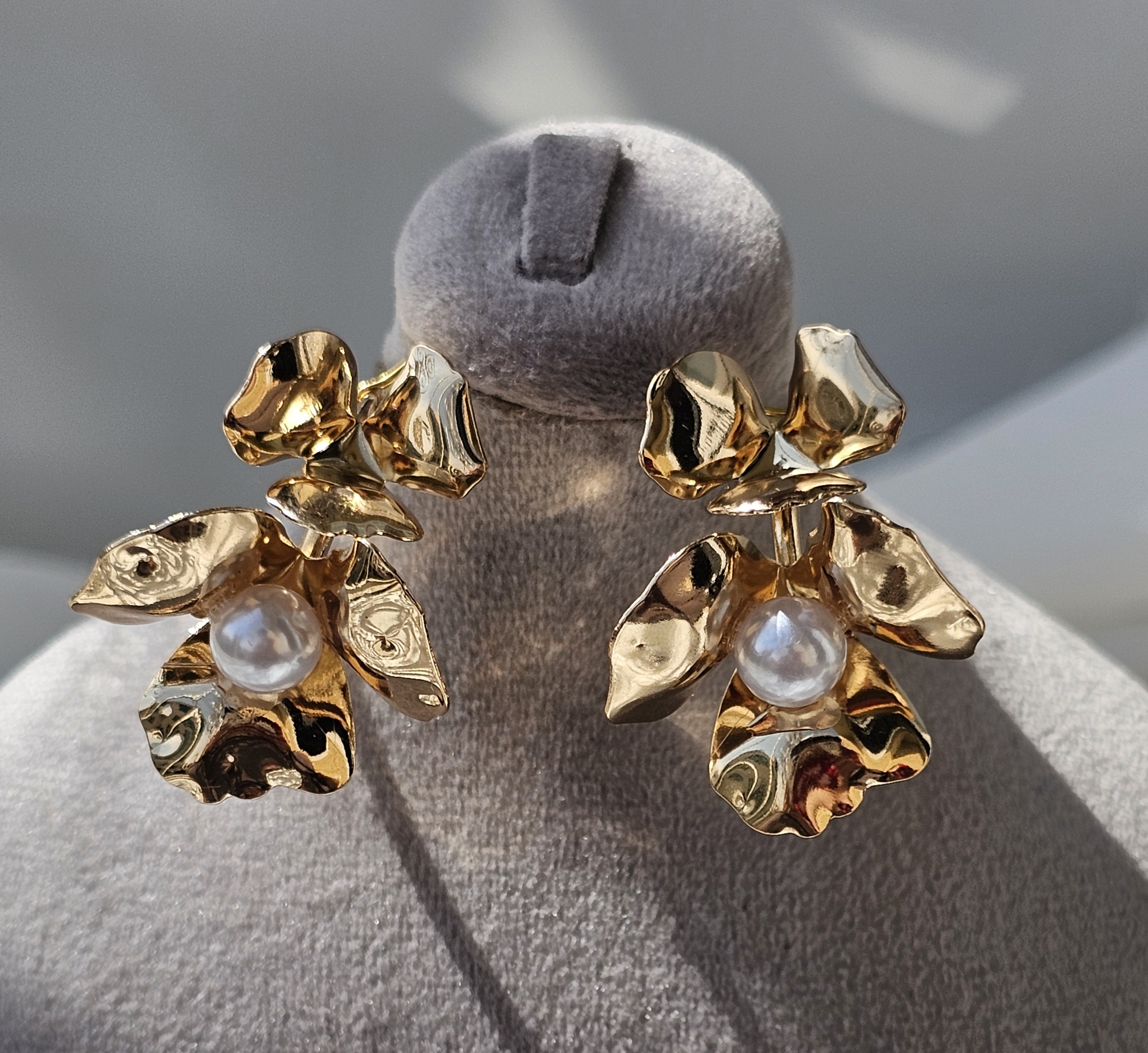 گوشواره گل دفرمه مجلسی 💛طلایی و مروارید دار 🥰🪽رنگ ثابت ضدحساسیت و میخ نقره از آویدخت شاپ